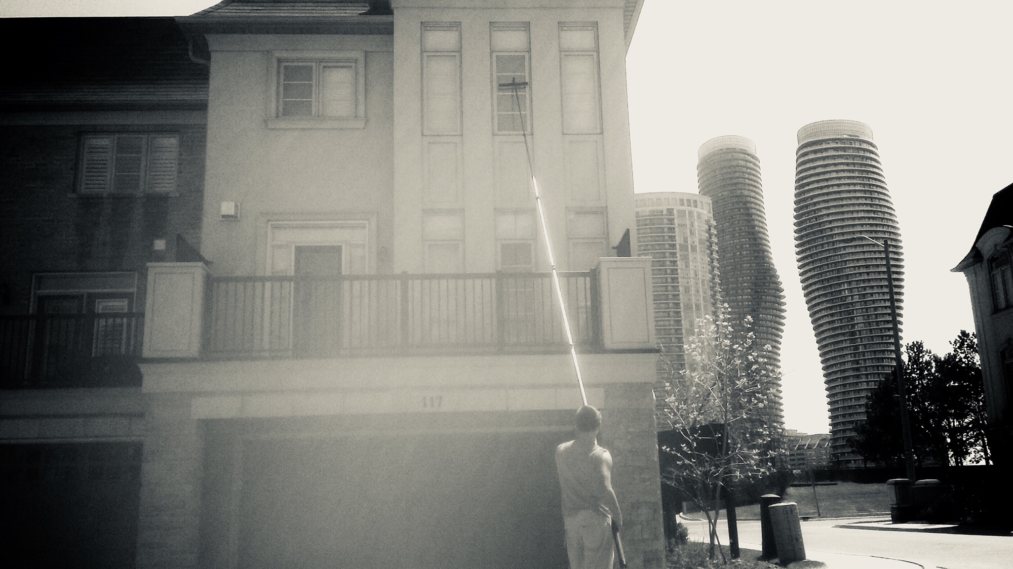 What a lovely day to clean windows in Mississagua. Here you can see the famous Marylyn Monroe buildings in the back ground. Call us today to have your town home complex cleaned by Skypole!