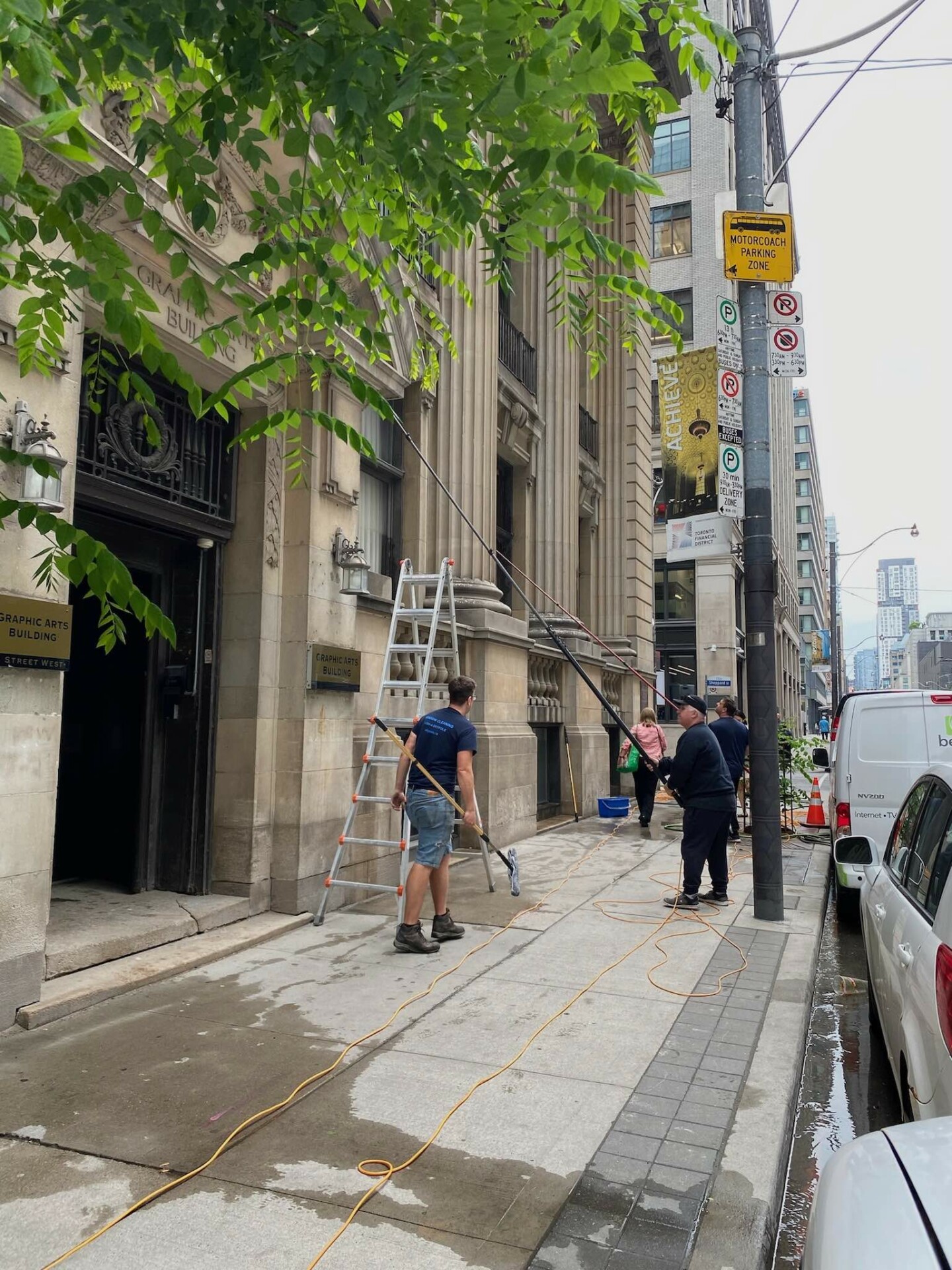 Skypole’s Solutions: Skypole, a renowned window cleaning company based in Toronto, rose to the occasion with their innovative approach. Using water-fed poles and purified water systems, Skypole’s team efficiently cleaned the building’s windows without ladders or harsh chemicals, ensuring safety and speed while protecting the building’s historic facade. Their advanced technology allowed them to easily navigate the busy street’s challenges, providing a thorough cleaning that revitalized the building’s appearance.