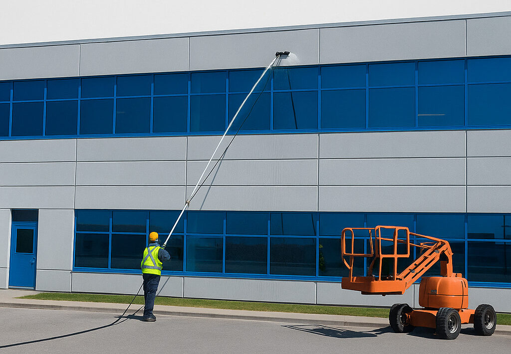 Window cleaning at F & P Manufacturing comes with unique logistical challenges. The building’s size and layout, including elevated glass panels and expansive factory spans, necessitate advanced equipment and meticulous coordination to minimise disruptions to daily operations. Safety is a top priority, as the site remains active during cleaning periods. Skypole utilises water-fed pole systems and aerial lift platforms to ensure access to every window, maintaining a strong focus on site safety and efficiency.