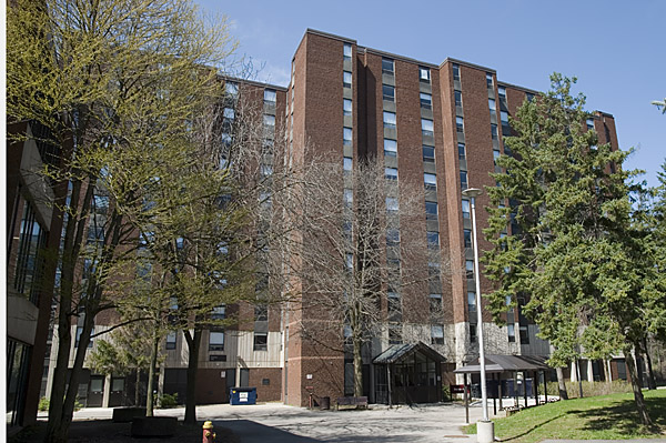 Brandon Hall is an eleven-storey student residence at McMaster University, featuring a modern glass façade and high visibility from both within the campus and the surrounding Hamilton area. Skypole was contracted to perform exterior window cleaning on the entire building, along with a comprehensive spider spraying service to prevent future buildup of webs and debris on the structure.