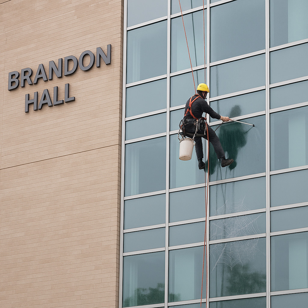 Like many buildings near green spaces, Brandon Hall had significant spider activity, especially around upper-floor ledges and structural joints. These areas are prone to web buildup, which quickly detracts from the appearance of newly cleaned windows.